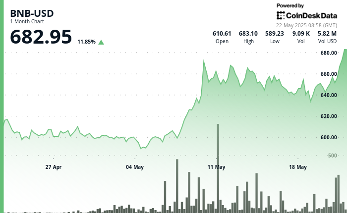 Technical indicators remain bullish for BNB, with strong support established at $682 and multiple tests of this level showing sustained buyer interest despite minor resistance around $684, according to CoinDesk Research’s technical analysis data model.